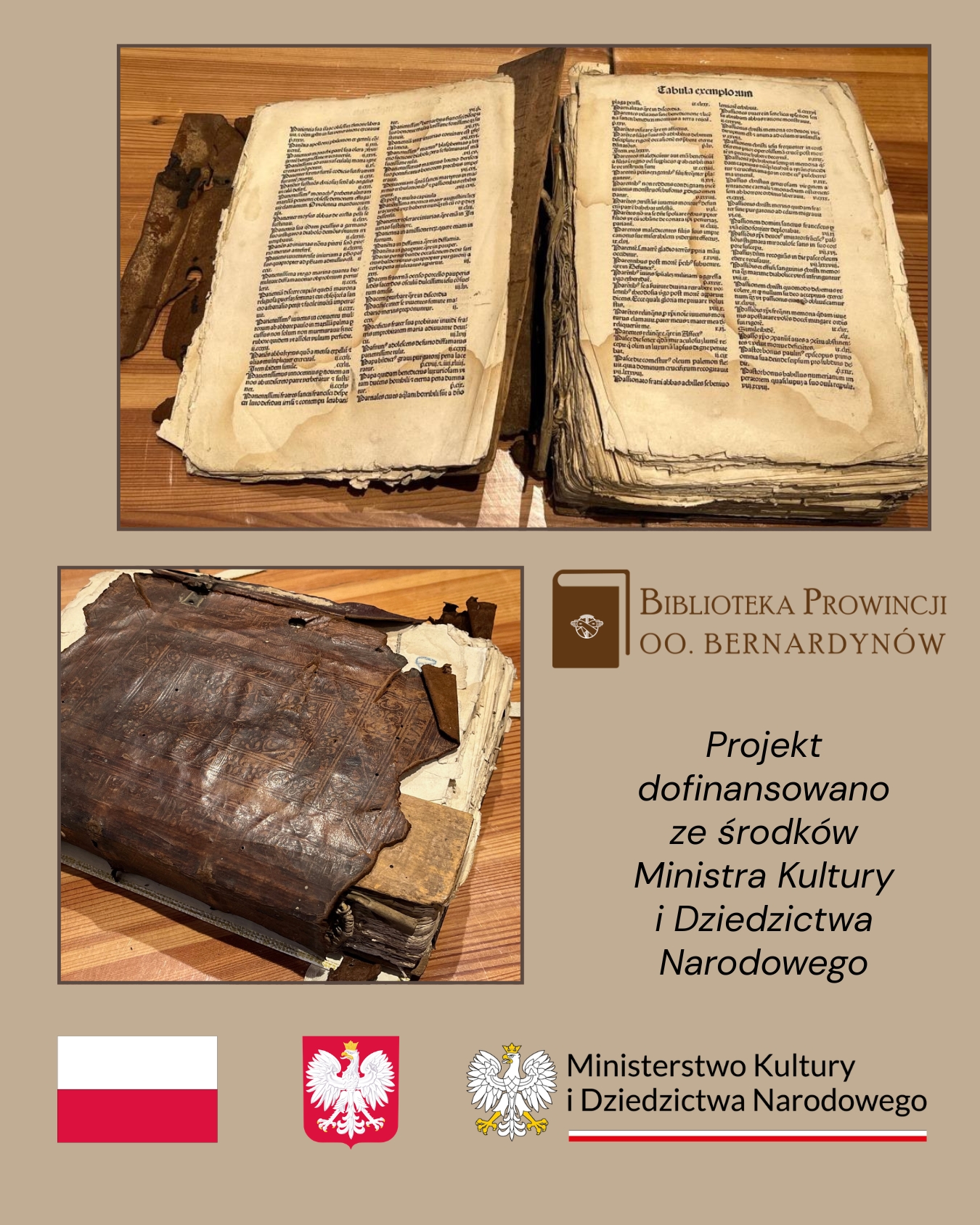 Zadanie „Prawdziwe Białe Kruki – kontynuacja konserwacji unikatowych inkunabułów z biblioteki Prowincji OO. Bernardynów w Krakowie” dofinansowano ze środków Ministra Kultury i Dziedzictwa Narodowego pochodzących z Funduszu Promocji Kultury – państwowego funduszu celowego.